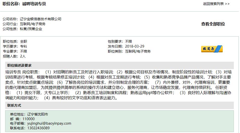 辽宁宝银信息技术有限公司诚聘培训专员2人