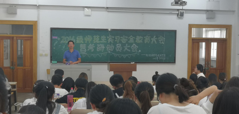 为提高我院学生实习安全意识,增强考研动力与信心,今年会官方网站于2019年9月3日下午2:00在博文楼107召开2016级师范生实习安全教育大会暨考研动员大会。出席本次会议的有党总支副书记张礼庆、团委书记朱春梅以及2016级全体师范生。