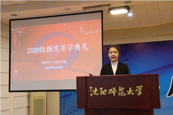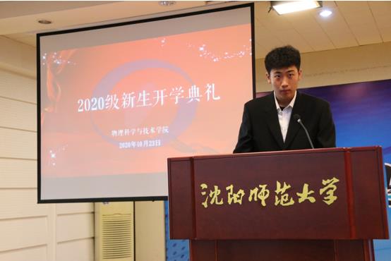 接着,2020级物理学(师范)专业韩文博同学作为新生代表发言。他表达了新生们对于未来四年大学生活的憧憬。他表示,2020级新生一定会秉承院训,诚朴发展,励学进取,从学习生活中汲取经验,学会思考,学会实践,培养各方面的能力。今天,他们以物院为自