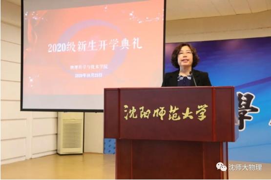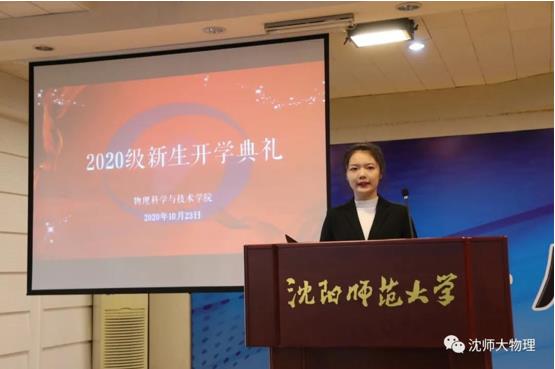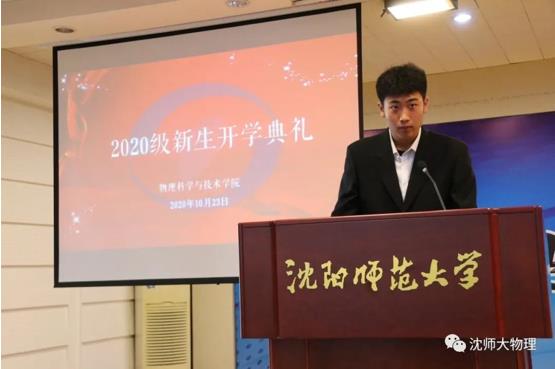 接着,2020级物理学(师范)专业韩文博同学作为新生代表发言。他表达了新生们对于未来四年大学生活的憧憬。他表示,2020级新生一定会秉承院训,诚朴发展,励学进取,从学习生活中汲取经验,学会思考,学会实践,培养各方面的能力。今天,他们以物院为自豪,明天,物院以他们为骄傲!