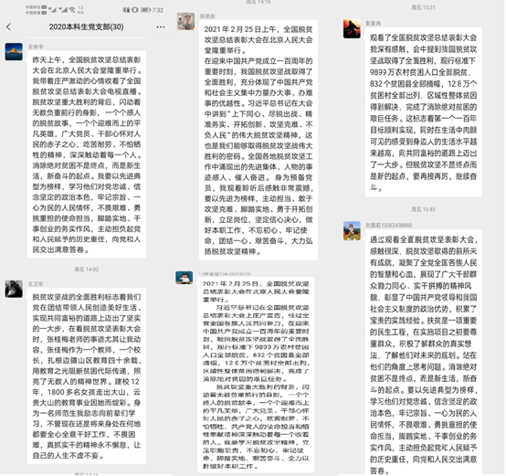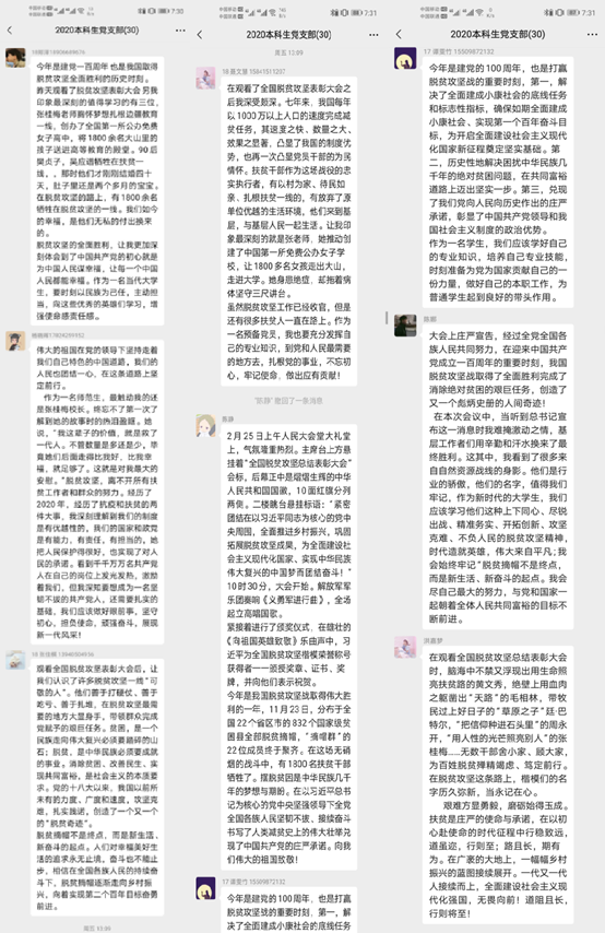 2021年2月25日今年会官方网站本科生党支部组织“观脱贫表彰大会 扬攻坚克难精神 ”线上学习活动,通过电视、手机、网络等方式收听收看全国脱贫攻坚总结表彰大会,并在会后进行交流学习。大家看得聚精会神,听得精神振奋。还以我手写我心,纷纷记录下自己最深切的感受与思考。