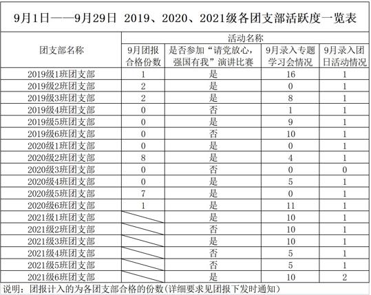 各团支部活跃度将作为团支部荣誉称号评比的依据之一。希望日后各支部积极参与学校学院组织的活动赛事、定期进行党史学习、每周认真学习“青年大学习”、开展丰富多样的团日活动等,以此丰富课外生活,提高精神觉悟。期待各团支部更精彩的表现!