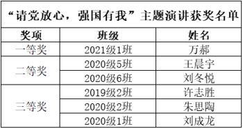 此次团日活动中,举行了“请党放心,强国有我”主题演讲比赛,其中2019级1班、2班、3班、5班,2020级1班、2班、4班、5班、6班,2021级1班,3班、6班积极参与,经过评委公平、公正、公开的评选,最终有来自六个团支部的六名选手获得奖项,希望获奖同学能够再接再厉,现公示如下: