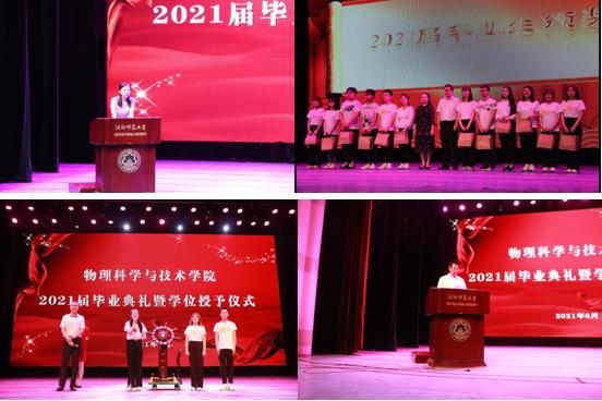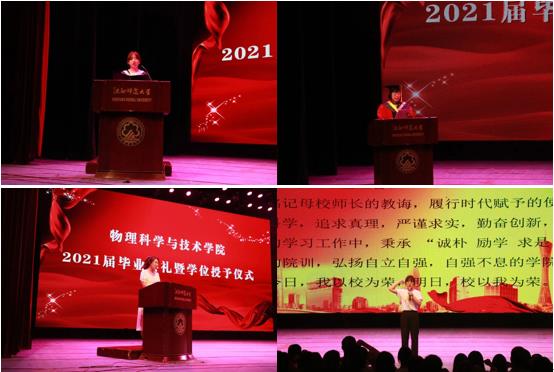 其次,由本科生毕业生代表赵博同学上台发言,言语之中饱含着对学院的感激之情以及对未来搏击长空的坚定信念。优秀硕士毕业生代表张宽发言,诉说了他记忆中的校园生活以及师生之间的情谊,同时鼓励在校生珍惜时间、找准定位、做出规划。在校学生代表刘书剑同学上台发言,表达了对毕业生们的祝愿与对学院未来的美好憧憬。由郭思彤、张艺竹、李达哲同学代表2021届毕业生向学院赠送礼物,张忠军书记代表学院接受毕业生献礼,同时,学生代表感谢学院四年对他们的培养与照顾,也希望学院以后可以再谱华章,桃李满天下。然后,今年会官方网站物理系主任高明教授、电子系主任申海教授依次上台为本科毕业生颁发学位证书,由学院院长吴丽娟教授亲自为本科、硕士毕业生拨正流苏,合影留念。院长吴丽娟教授做毕业致辞,首先祝贺2021届全体毕业生,同时也希望他们可以坚守梦想,勿忘初衷,指出大家要努力去做有价值的人,为国家的建设奉献更多的智慧和力量,传承中国精神,彰显新时代青年价值。吴院长希望全体毕业生可以保持终身学习的习惯,守住善的灵魂。最后由陈静同学上台领誓,毕业生同学集体宣誓,典礼至此结束。