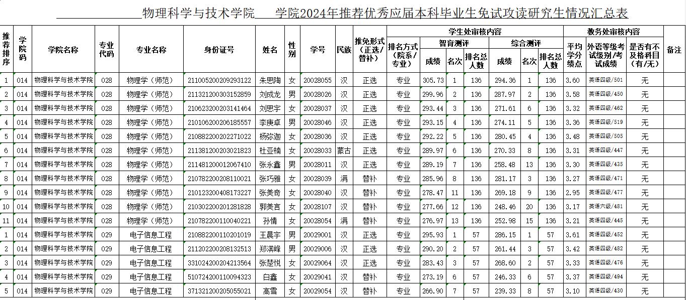 根据教育部《全国普通高等学校推荐优秀应届本科毕业生免试攻读硕士学位研究生工作管理办法》(教学〔2006〕14号)《教育部办公厅关于进一步加强推荐优秀应届本科毕业生免试攻读研究生工作的通知》(教学厅〔2013〕8 号)《教育部办公厅关于进一步完善推荐优秀应届本科毕业生免试攻读研究生工作办法的通知》(教学厅〔2014〕5号)以及学校下发的《沈阳师范大学关于做好2024年推荐优秀应届本科毕业生免试攻读研究生工作的通知》,我院结合《沈阳师范大学推荐优秀应届本科毕业生免试攻读硕士研究生工作办法(试行)》(沈师大委〔2021〕52号)以及《今年会官方网站2024 年研究生推免工作实施细则》的具体实施办法(物理学7个推荐名额,电子信息工程3个推荐名额),通过自愿申报、资格审查、学院综合测评小组整理审核,按照学校“参加推免学生在满足推免基本条件且前3个学年综合素质测评成绩、智育测评成绩均进入所在专业同年级学生总数前30%的基础上,最终以前3学年智育测评成绩排名作为推免依据和推免顺序”的要求,经学院推荐免试攻读硕士研究生工作领导小组审查,按照1:1.5的初选比例,拟推荐名单如下: