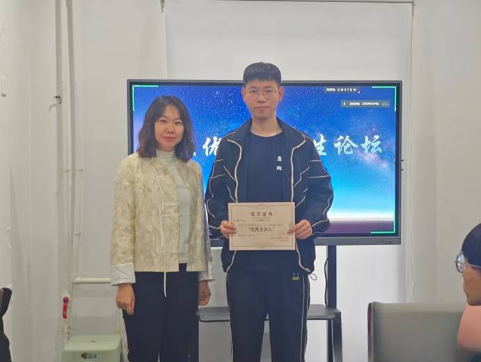 分享完成后,朱春梅老师为刘猛同学颁发优秀主讲人荣誉证书,愿他扬帆起航,踏浪前行。