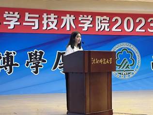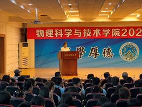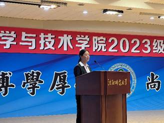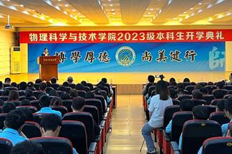 典礼第二项,教师代表基础物理教研室于吉主任讲话。于吉老师首先代表全院老师对新同学的到来表示热烈欢迎,并期盼在今后的的大学生生涯能取得骄人的成绩。对23级新同学们表达了祝愿,倡导同学们要学会自主学习,锻炼各项能力、坚持初心与梦想,以饱满的热情迎接大学生活。
